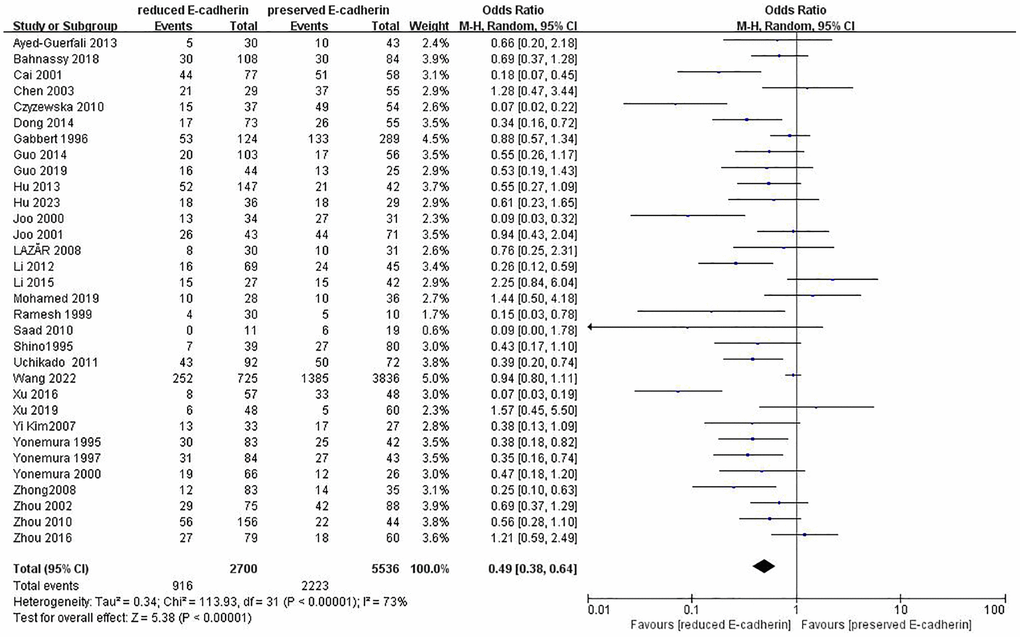 | Lymphatic node metastasis | 32 | RE = 2700, PE = 5536 | 0.49 (0.38–0.64) | 5.38 | <0.00001 | 73 | |||||||||||||||||||||||||||||||||||||||||||||||||||||||||||||||||||||||||||||||||||||||||||||