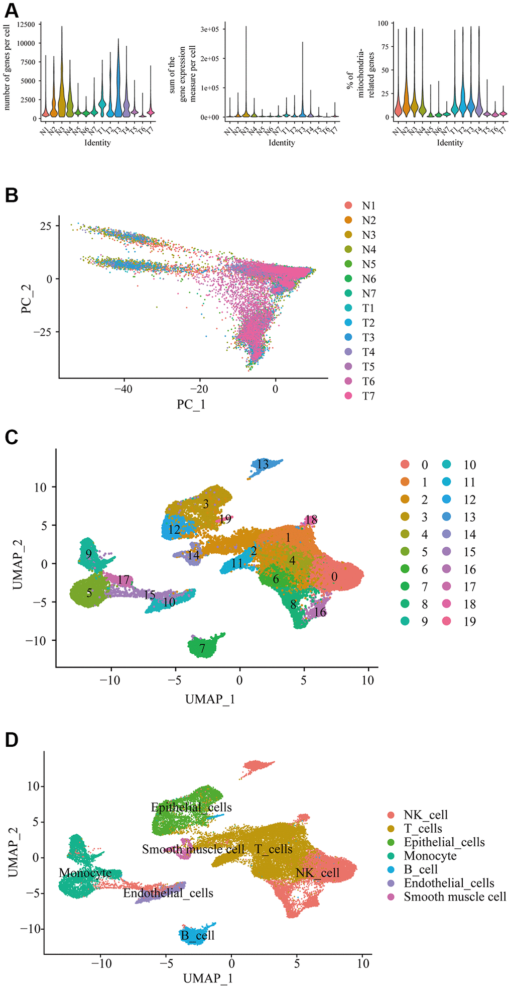When we combined and analyzed the 2 datasets of prostate cancer single cell data, we identified the number of genes measured per cell, the sum of the gene expression measured per cell and the percentage of mitochondria-related genes (Figure 1A). The distribution of each cell in different samples was shown in the PCA plot, and it can be found that there is no significant batch effect among the 14 samples under canonical correlation analysis (Figure 1B). In the uniform manifold approximation and projection (Umap) cluster analysis, 19 cell clusters were identified (Figure 1C). Each cluster was attributed to different cell type using SingleR automatic annotation package, in which clusters 0, 8, 13, 15, 16, and 18 belong to natural killer cell; clusters 1, 2, 4, 6, and 11 belong to T cell; clusters 7 and 19 belong to B cell; clusters 5, 9, 17, belong to monocyte; clusters 3 and 12 belong to epithelial cell; cluster 10 belongs to endothelial cells; and cluster 14 belongs to smooth muscle cells (Figure 1D). It should be noted that the automated annotation package annotated the clustering 14 as chondrocytes, in which, it should not be in the prostate tissue. So, we redid the analysis manually to analyze the top 10 expressed genes in the cluster 14, including TAGLN, RGS5, IGFBP5, ACTA2, IGFBP7, CALD1, MYL9, TPM2, TIMP3, NR2F2 through the online website Cell Taxonomy (https://ngdc.cncb.ac.cn/celltaxonomy/), we found that TAGLN, MYL9, and TPM2 genes indeed highly expressed in smooth muscle cell. Then we compared the gene expression profile between cancer tissues (named “T”) and the adjacent normal tissues (named “N”) to determine the DEGs in prostate cancer in single-cell level, in which there were 28 DEGs in B cell (Table 1); 31 DEGs in NK cell (Table 2); 31 DEGs in T cell (Table 3); 44 DEGs in monocyte (Table 4); 257 DEGs in epithelial cells (Supplementary Table 1); 30 DEGs in endothelial cells (Table 5); and 37 DEGs in smooth muscle cells (Table 6).