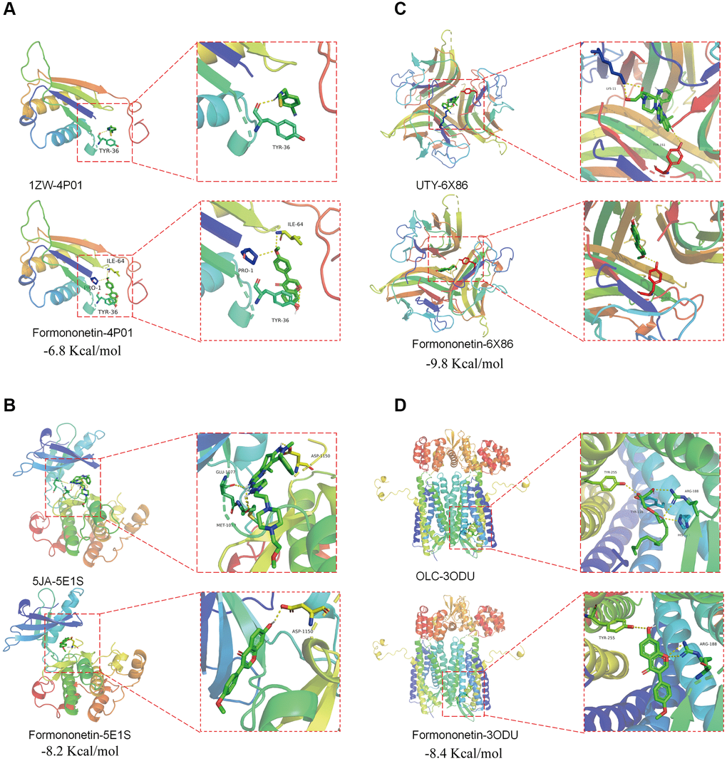 The PDB database was searched for the protein structure of CD74, INSR, TNF, and CXCR4, and we found 4P01 [31], 5E1S [32], 6X86 [33], and 3OE0 [34] for docking analysis, respectively. An active cavity box model was established using PyMOL (version 2.5). For CD74 protein (PDB ID: 4P01), the active cavity box model was set at center x, y, z to −38.654, −14.151, 5.771, size x, y, z to 15.0, 15.0, 15.0, and the RMSD of the proto-ligand to 1.7 Å. We found that the formononetin could bind the CD74 protein (PDB ID: 4P01) through the formation of hydrogen bonds with the amino acid residues TYR-36 (3.5 Å), ILE-64 (3.2 Å), PRO-1 (3.2 Å) and its free docking energy with the protein was −6.8 Kcal/mol (Figure 5A). For INSR protein (PDB ID: 5E1S), the active cavity box model was set to center x, y, z of 3.538, 19.827, 21.984, size x, y, z of 15.0, 15.0, 15.0, and RMSD of the proto-ligand of 2.1 Å. Formononetin formed a hydrogen bond with amino acid residue ASP-1150 (2.2 Å) of INSR protein (PDB ID: 5E1S), and its free docking energy with the protein was −8.2 Kcal/mol (Figure 5B). For TNF protein (PDB ID: 6X86), the active cavity box model was set with center x, y, z of 55.474, −6.73, 9.924, size x, y, z of 15.0, 15.0, 15.0, the RMSD of the proto-ligand was only one and calculated to be 0.000 Å. Formononetin formed hydrogen bond with amino acid residue TYR-151 (2.9 Å) of TNF protein (PDB ID:6X86) and its free docking energy with the protein was −9.8 Kcal/mol (Figure 5C). For CXCR4 protein (PDB ID: 3ODU), the active cavity box model was set with center x, y, z of −13.203, 15.376, 71.731, size x, y, z of 15.0, 15.0, 18.75, and RMSD of the proto-ligand of 2.1 Å. Formononetin formed hydrogen bond with amino acid residue TYR-225 (3.4 Å), ARG-188 (3.2 Å) of CXCR4 protein (PDB ID: 3ODU) and its free docking energy with the protein was −8.4 Kcal/mol (Figure 5D). Taken together, our results suggested a possible direct binding of formononetin with its target proteins CD74, INSR, TNF, and CXCR4.