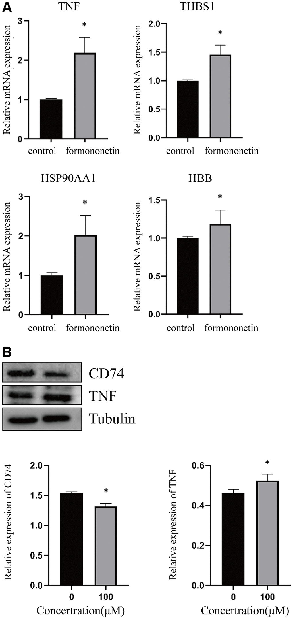 In order to validate the finding of network pharmacology, we treated the human prostate cancer cell DU145 with formononetin, followed by qPCR analysis and WB. The result of qPCR analysis showed that the treatment of formononetin could induce the mRNA expression of TNF, THBS1, HSP90AA1, and HBB (Figure 6A). To further validate the effect of formononetin on the stability of its target proteins, Western blotting was performed. The result showed that treatment of formononetin could increase the protein level of TNF, but decrease the protein level of CD74 (Figure 6B), suggesting the binding of formononetin may regulate the stability of its target proteins.