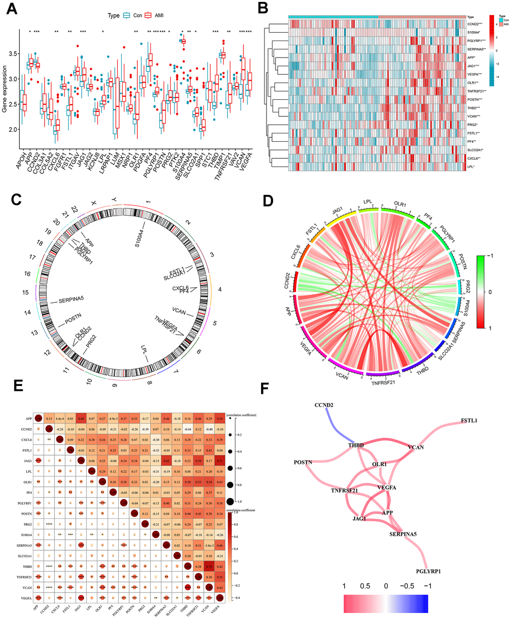 Differential expression analysis between healthy individuals and patients with AMI was performed, and 18 differentially expressed ARGs were selected (Figure 1A). Among them, the expression of most genes included APP, CXCL6, FSTL1, JAG2, LPL, OLR1, PF4, PGLYRP1, POSTN, PRG2, SERPINA5, SLCO2A1, THBD, TNFRSF21, VCAN, and VEGFA were significantly upregulated in AMI samples, while S100A4 and CCND2 were downregulated in AMI samples (Figure 1B). The location of the 18 differentially expressed ARGs on the various chromosomes was displayed in Figure 1C.