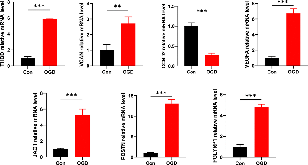 In contrast to control groups, the expression of THBD, VCAN, VEGFA, JAG1, POSTN, and PGLYRP1 in OGD groups was significantly increased, while the expression of CCND2 in OGD groups was significantly decreased (all P < 0.05) (Figure 10). It was consistent with the results of the bioinformatics analysis and further validated our conclusions.
