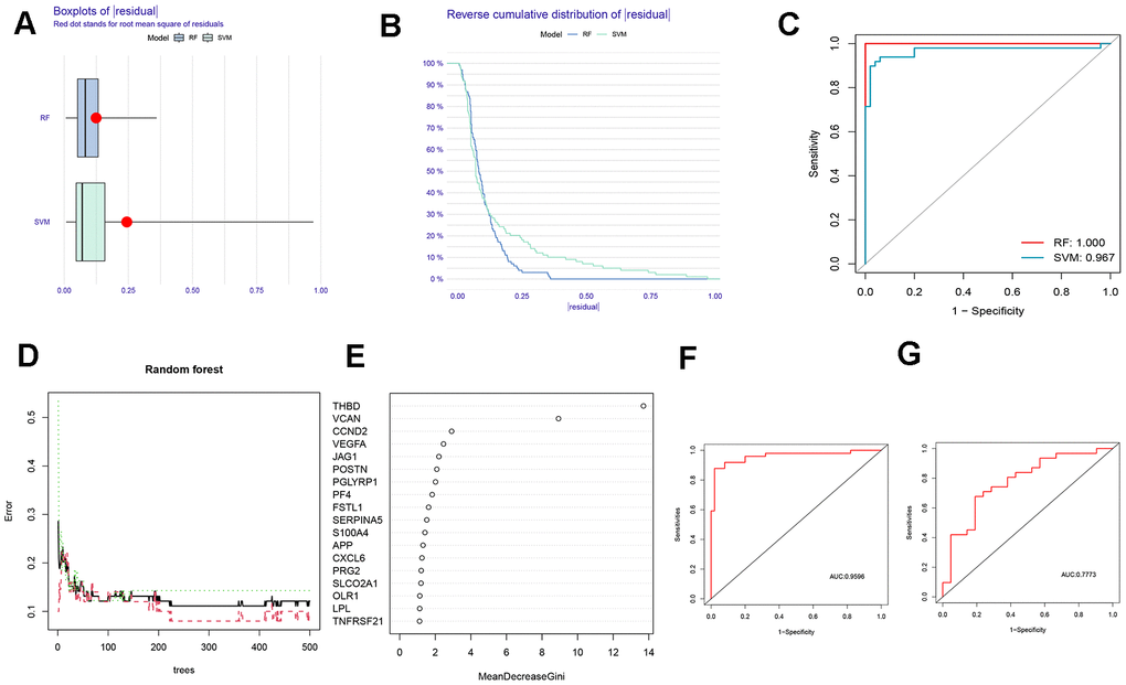 In this study, we constructed and compared models based on two machine learning algorithms, including random forest (RF) and support vector machine (SVM). RF incorporates a bagging algorithm and randomized feature algorithm, which can be effectively self-supervised and has more significant advantages over other machine learning methods [16]. The SVM is constructed based on the statistical learning principle of risk minimization through structure and has been widely used for genome classification or subtyping in recent years [17]. We effectively evaluated both algorithms by box line plots of residuals, inverse distribution plots of residuals, receiver operating characteristic (ROC) curves, and random forest tree plots.