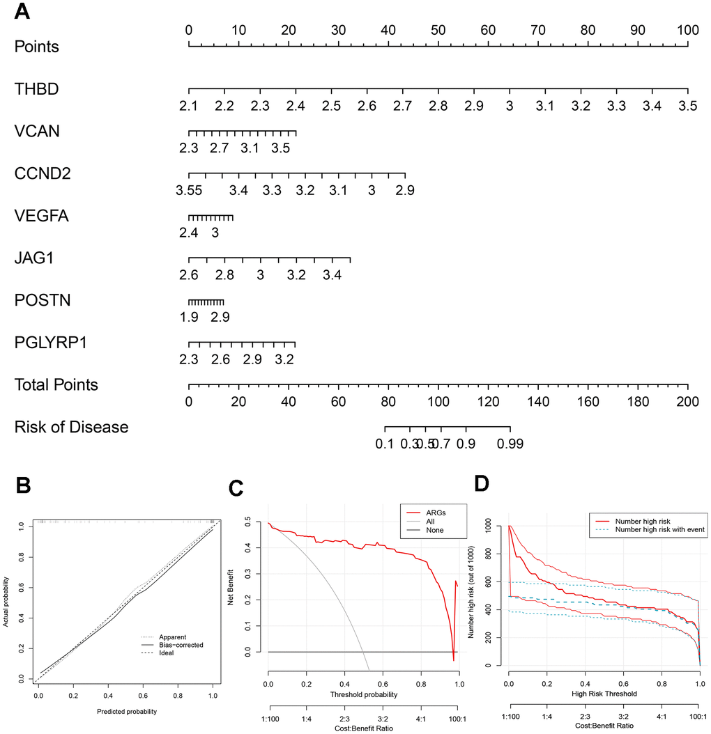 A nomogram was plotted to visualize the predictive models of AMI based on the sum of each gene expression score (Figure 3A). 7 genes included THBD, VCAN, CCND2, VEGFA, JAG1, POSTN and PGLYRP1 were involved in the model. The bias-corrected line was close to the ideal dotted line in Figure 3B, illustrating the model’s good prediction ability. Besides, DCA, in which the curve of ARGs deviated from two extreme ones, was performed, indicating the model’s great clinical utility (Figure 3C). The CIC proved the availability of a nomogram by comparing the number of predicted and actual patients under different probability thresholds (Figure 3D).