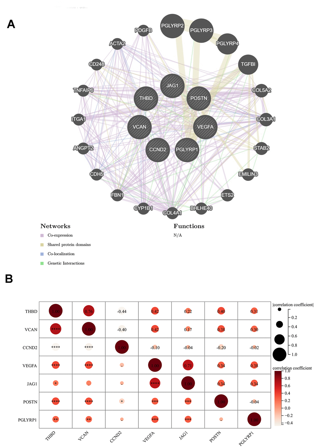 The result of the correlation analysis of each significant gene was shown in Figure 4B. A significant positive correlation between THBD and VCAN could not be ignored, while CCND2 was respectively negatively correlated with them. The correlation coefficient between any two genes in VEGFA, POSTN, THBD, and VCAN was about 0.4.