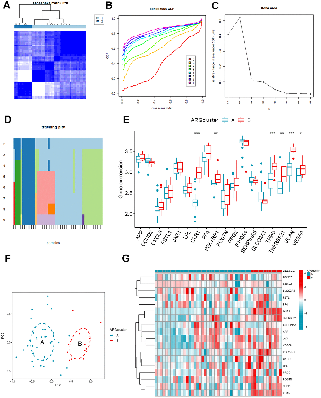 To further explore the connection between ARGs and AMI, we performed a consensus clustering of angiogenic patterns based on 18 differentially expressed ARGs. Combining the result of Figure 5A–5D, two ARG patterns were separated based on 7 signature ARGs. Among the differentially expressed genes, the expression of OLR1, PGLYRP1, THBD, TNFRSF21, VCAN, and VEGFA was higher in cluster B (Figure 5E, 5G). The PCA showed that 7 ARGs could distinguish two patterns (Figure 5F).