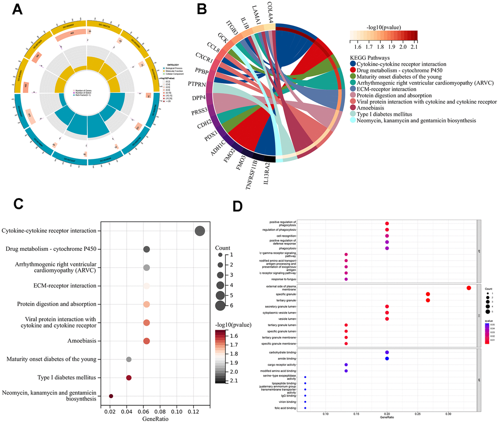 To better understand the feasible mechanisms of DEGs in AMI, we performed GO and KEGG analysis in two different ARG modes. GO results depicted that DEGs mainly aggregated in terms of BP and MF. These differential genes were mainly enriched in the positive regulation of phagocytosis, Fc-gamma receptor signaling pathway, cell recognition, external side of the plasma membrane, specific granule, and tertiary granule (Figure 7A, 7D). KEGG results showed that the DEGs were mainly enriched in cytokine-cytokine receptor interaction, drug metabolism-cytochrome P450, and arrhythmogenic right ventricular cardiomyopathy (ARVC) (Figure 7B, 7C).