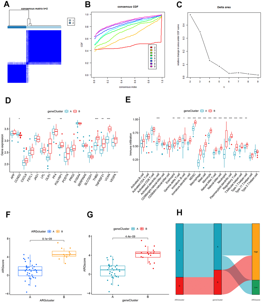 We used the consensus clustering method to divide the patients with AMI into different genetic models and found that the results were consistent with the ARG mode (Figure 8A–8C). The grouping accuracy was further supported by the findings of differential expression analysis and immune cell infiltration in gene patterns, which were comparable to those of the ARG model (Figure 8D, 8E). Moreover, we also used PCA to calculate the scores between different samples of the ARG model as well as the gene model, and the results showed higher scores for clusters B or gene clusters B (Figure 8F, 8G). Furthermore, the Sankey diagram showed the relationship between the ARG, the genes, and the ARG score (Figure 8H).