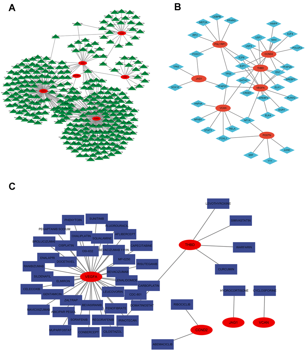 The miRNA network map included 326 nodes, including 6 signature genes and 320 miRNAs. We found the highest number of identical target miRNAs responsible for regulating VEGFA with CCND2 and the lowest number of miRNAs responsible for regulating PGLYRP1. The network diagram showed that some miRNAs were associated with two signature gene expressions. MiR-335-5p target mRNA was PGLYRP1 and THBD; miR-5003-3p target mRNA were VCAN and JAG1; has-miR-107 target mRNA were VCAN and VEGFA (Figure 9A and Supplementary Table 1). Figure 9B showed the seven signature genes with transcription factors, and it showed that transcription factor FOXC1 acted on PGLYRP1 and JAG1; transcription factor TFAP2C acted on THBD, VCAN, and PGLYRP1; transcription factor NFYA acted on VEGFA, VCAN, and POSTN; transcription factors USF1 and USF2 both acted on CCND2 and THBD (Supplementary Table 1).