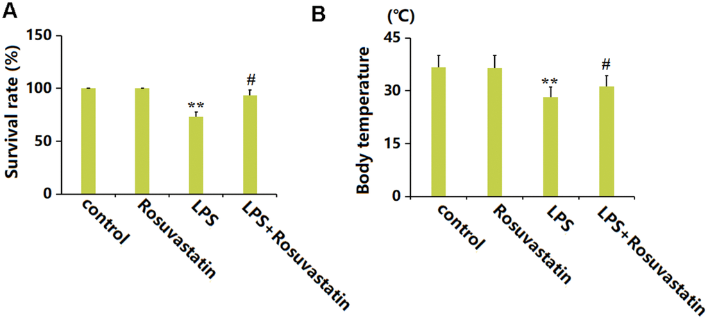 Mice were dosed with 5 mg/kg/day Rosuvastatin for 20 weeks, with or without subsequent LPS stimulation. The survival percentage of experimental mice was maintained at 100% in the Rosuvastatin group but greatly reduced to 73.3% by LPS, then markedly increased to 93.3% in the LPS+ Rosuvastatin group (Figure 1A). Furthermore, the mean body temperatures in the control, Rosuvastatin, LPS, and LPS+ Rosuvastatin groups were 36.6° C, 36.5° C, 28.2° C, and 31.3° C, respectively (Figure 1B).