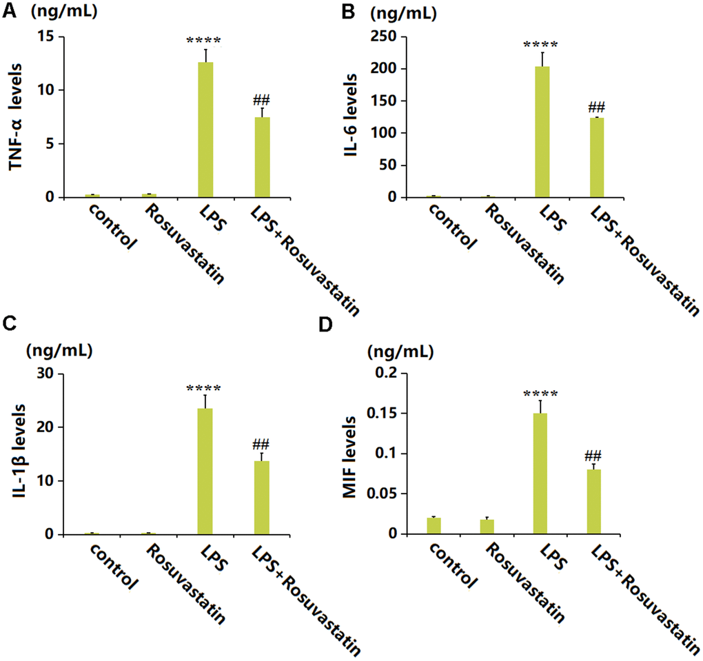 To evaluate the inflammatory state in each animal, peritoneal lavage supernatants were collected for detection. The TNF-α level was slightly increased from 0.25 to 0.31 ng/mL by Rosuvastatin and markedly increased to 12.6 ng/mL by LPS stimulation, then greatly reduced to 7.5 ng/mL in the LPS+ Rosuvastatin group (Figure 2A). The IL-6 levels in the control, Rosuvastatin, LPS, and LPS+ Rosuvastatin groups were 2.6, 2.1, 203.5, and 123.7 ng/mL, respectively (Figure 2B). Moreover, the IL-1β level was slightly increased from 0.31 to 0.32 ng/mL by Rosuvastatin and notably increased to 23.5 ng/mL by LPS stimulation, then remarkably declined to 13.7 ng/mL in the LPS+Rosuvastatin group (Figure 2C). The MIF levels in the control, Rosuvastatin, LPS, and LPS+ Rosuvastatin groups were 0.02, 0.018, 0.15, and 0.08 ng/mL, respectively (Figure 2D).