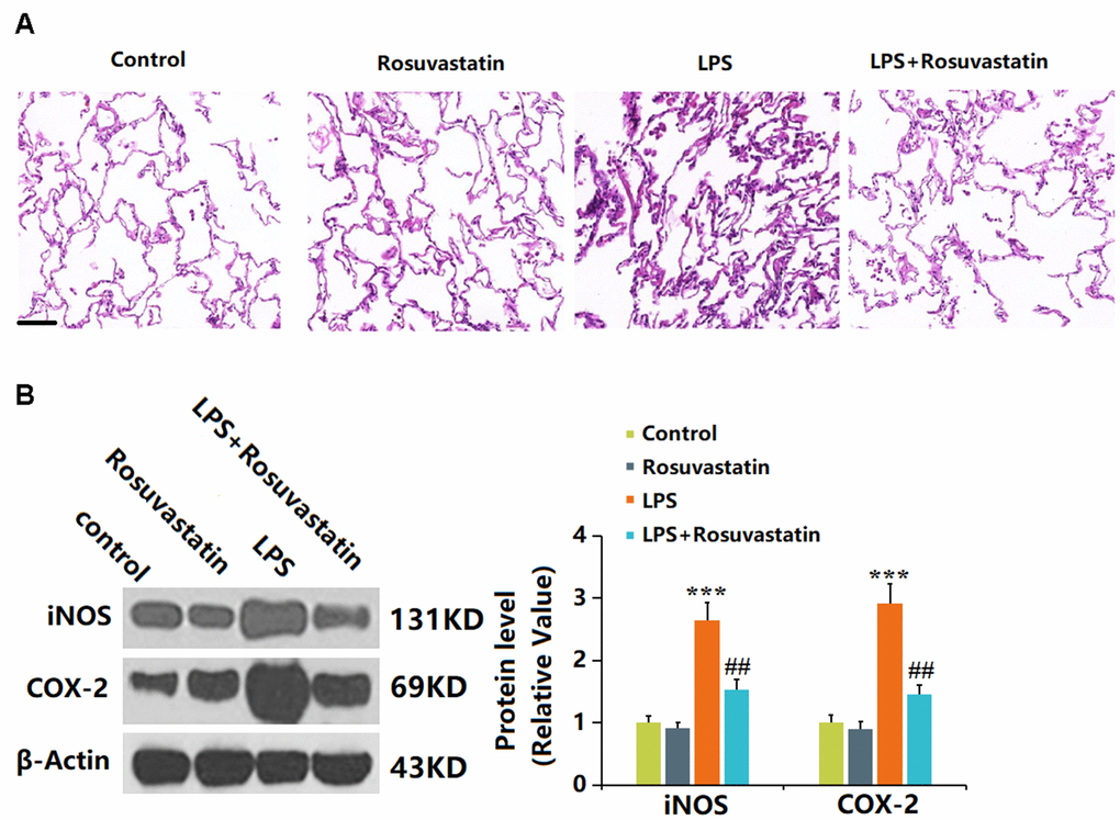 Lung tissue is severely influenced by sepsis [18]. No significant pathological changes in lung tissues were observed in the control and Rosuvastatin groups. In the LPS group, the infiltration of immune cells in the lung tissue was increased, the necrosis severe, and hyperemia and edema observed, which were sharply alleviated in the LPS+ Rosuvastatin group (Figure 4A). Furthermore, iNOS and COX-2 levels in lung tissues were slightly reduced in the Rosuvastatin group and notably increased by LPS stimulation, then markedly reduced by Rosuvastatin (Figure 4B).