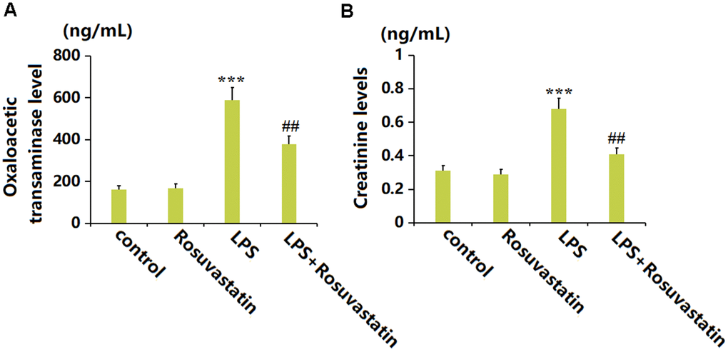 Heart and kidney function is reported to be severely impaired by sepsis [19, 20]. The oxaloacetic transaminase level was slightly changed in the Rosuvastatin group and greatly elevated to 588.2 ng/mL by LPS stimulation, then remarkably decreased to 379.5 ng/mL by Rosuvastatin (Figure 5A). Moreover, the Creatinine levels in the control, Rosuvastatin, LPS, and LPS+ Rosuvastatin groups were 0.31, 0.29, 0.68, and 0.41 ng/mL, respectively (Figure 5B).