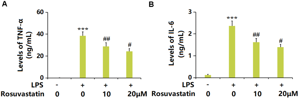 RAW 264.7 macrophages were obtained from ATCC (USA) and cultured in Dulbecco’s modified eagle medium (DMEM) supplemented with 10% fetal bovine serum (FBS) under the condition of 5% CO2 and 37° C. To study the function of Rosuvastatin in vitro, RAW 264.7 macrophages were stimulated with LPS (10 ng/mL) with or without Rosuvastatin (10 and 20 μM) for 24 h.
