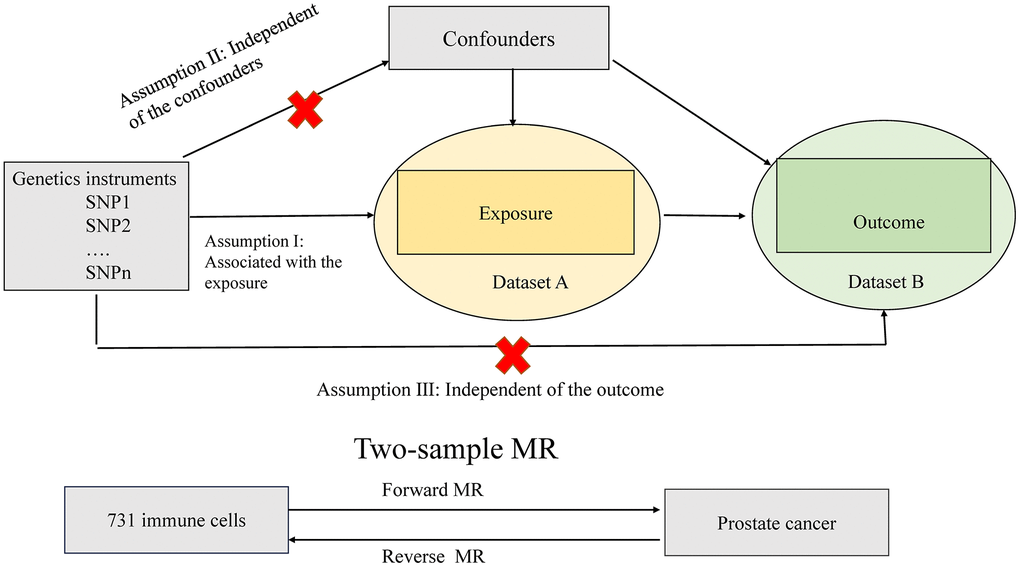 Figure 1 depicts the design and assumptions of this study, which utilized Mendelian randomization (MR) in a two-sample framework using genome-wide association studies (GWAS) summary statistics to explore cause association between 731 immune cell signatures and PCa. MR analysis is a gene-based approach that leverages naturally allocated genetic variants at conception to infer causal effects between exposure and outcomes. Our study relies on three key assumptions: (1) the instrumental variables, i.e., the genetic variants, should be strongly associated with the exposure; (2) the instrumental variables should not be associated with any confounding factors; and (3) there should be no direct connection between the instrumental variables and the outcome (Figure 1). Ethical approval was not required for our research as we used publicly available summary data from existing studies that had already undergone ethical review by academic ethics committees, with participants providing written informed consent. Our study adhered to the STROBE-MR guidelines, and the supporting information Supplementary Table 1 contains the corresponding checklist (Supplementary Table 1).