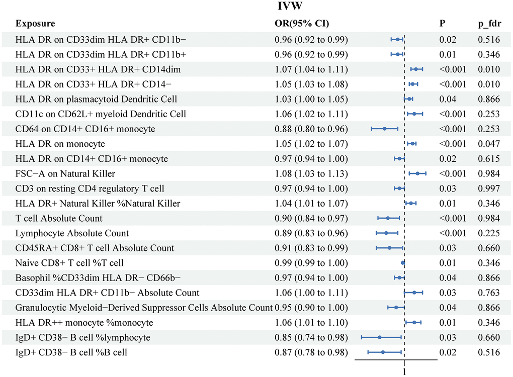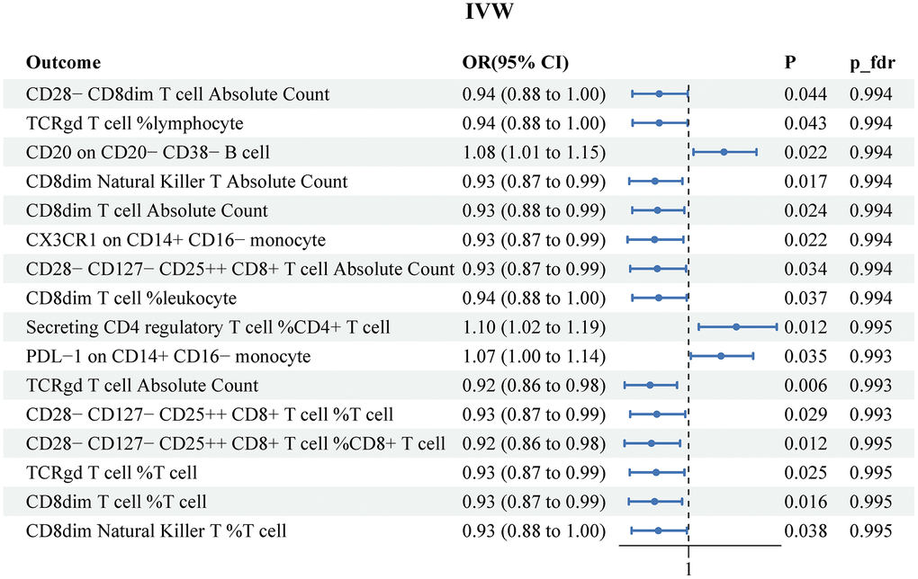 The results of the MR IVW analysis indicated that PCa was correlated with 16 immune traits. These comprised of 3 risk factors (CD20 on CD20− CD38− B cell, Secreting CD4 regulatory T cell %CD4+ T cell and PDL−1 on CD14+ CD16− monocyte) and 13 protective factors (CD28− CD8dim T cell Absolute Count, TCRgd T cell %lymphocyte, CD8dim Natural Killer T Absolute Count, CD8dim T cell Absolute Count, CX3CR1 on CD14+ CD16− monocyte, CD28− CD127− CD25++ CD8+ T cell Absolute Count, CD8dim T cell %leukocyte, TCRgd T cell Absolute Count, CD28− CD127− CD25++ CD8+ T cell %T cell, CD28− CD127− CD25++ CD8+ T cell %CD8+ T cell, TCRgd T cell %T cell, CD8dim T cell %T cell, and CD8dim Natural Killer T %T cell. (Figure 4). Supplementary Table 6 recorded the results obtained from the other three MR methods. However, after conducting FDR adjustment (PFDR<0.05), none of the immune traits were found to be significant at the 0.05 level (all P_fdr>0.05). The heterogeneity test and horizontal pleiotropy test results were separately described in Supplementary Tables 7, 8.