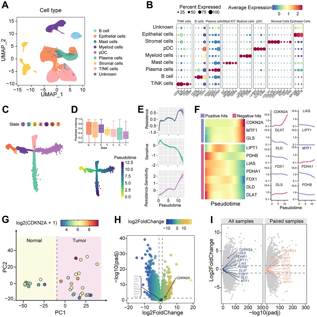 To investigate the expression characteristics of cuproptosis-associated genes in colorectal cancer, we performed dimensionality reduction clustering on scRNAseq data from colorectal cancer and normal tissues. Based on the expression levels of marker genes for different cell types, we identified epithelial cells, stromal cells, immune cells, and a group of unknown cells (Figure 1A, 1B). In the evolutionary trajectory constructed on tumor epithelial cells (Figure 1C), cytoTRACE identifies state 6 as the earliest pseudotime cell (Figure 1D). It is noteworthy that the resistance capacity of tumor epithelial cells to cuproptosis is increasing along the trajectory of tumor evolution (Figure 1E). Genes associated with cuproptosis resistance showed a general increasing trend, while the expression of sensitive genes decreased. Among them, the increasing trend of CDKN2A was the most representative (Figure 1F). This indicates the acquisition of cuproptosis resistance phenotype during malignant tumor progression.