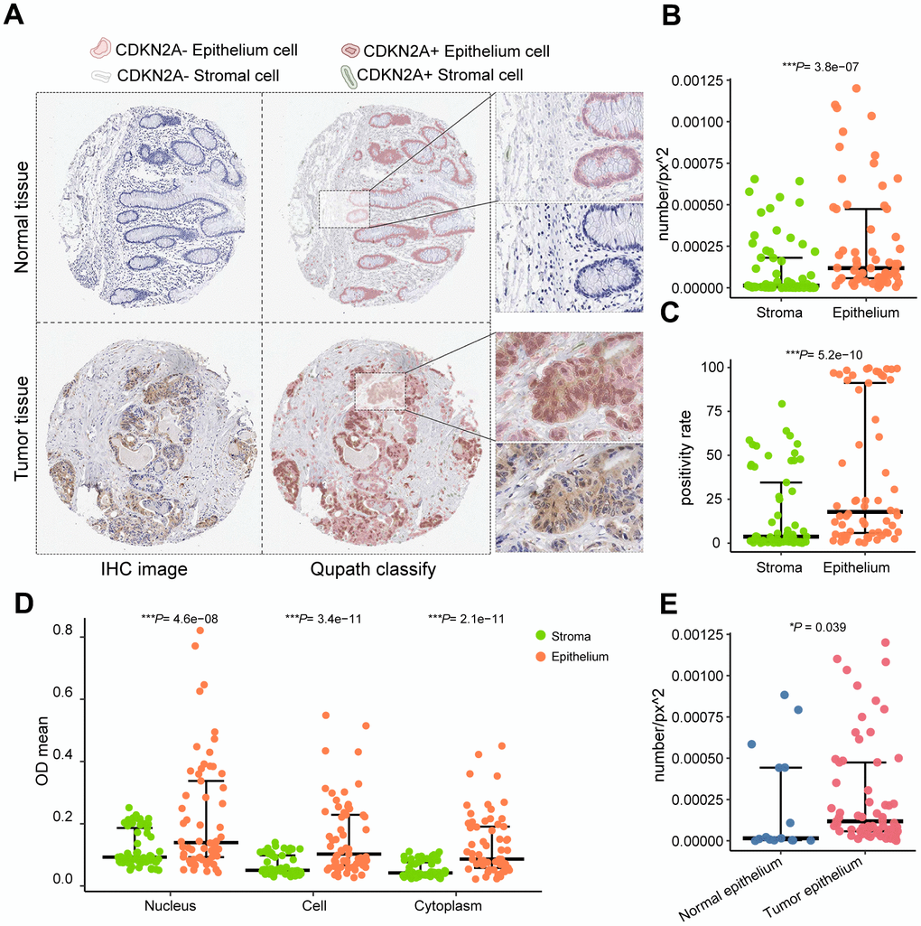 To visualize the expression and distribution of CDKN2A in tissues, we employed Qupath for image recognition on immunohistochemical sections. Epithelial cells and stromal cells of both colorectal cancer and normal tissue slices were identified (Figure 2A). Significantly higher positive rates, OD values, and positive densities of CDKN2A were observed in tumor epithelial cells compared to stromal cells (Figure 2B–2D). Tumor epithelium displayed a higher density of CDKN2A positivity in comparison with normal tissue (Figure 2E). These distributional patterns suggest localized and heterogeneous overexpression of CDKN2A in the epithelium of colorectal cancer.