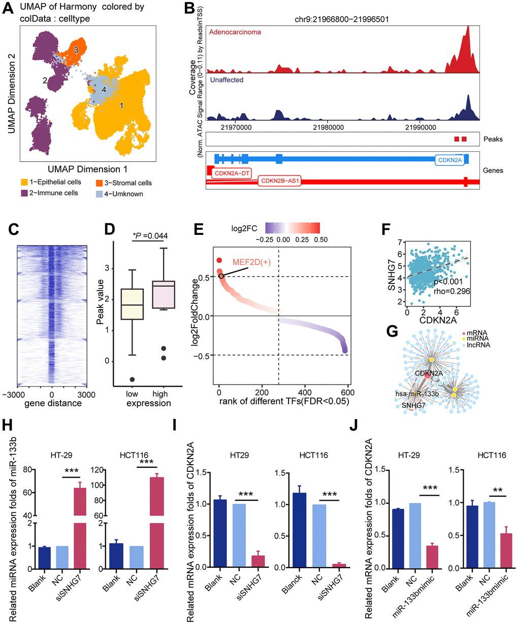 To elucidate potential mechanisms driving CDKN2A upregulation in colorectal cancer, we examined epigenetic modification and transcriptional regulation. ScATACseq data was analyzed using ArchR to identify epithelial cells derived from both colorectal cancer and unaffected tissues (Figure 3A). Higher chromatin accessibility levels were observed in colorectal cancer epithelial cells compared to normal epithelial cells within the CDKN2A gene region (Figure 3B). Similar findings were obtained in the TCGA cohort. A significant increase in chromatin accessibility was observed at the CDKN2A gene locus in tissues exhibiting elevated CDKN2A expression levels (Figure 3C, 3D). Nonetheless, no statistically significant correlation was observed between CDKN2A expression and either copy number variation or promoter methylation (Supplementary Figure 1). Leveraging the observed changes in chromatin accessibility, pySCENIC was employed to identify transcription factors capable of regulating the transcription of CDKN2A. The results show that MEF2D is enriched in CDKN2A-expressing tumor epithelia and can target CDKN2A (Figure 3E).