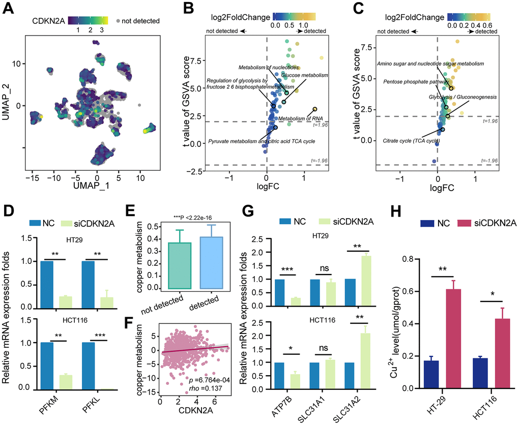 Considering the close correlation between cuproptosis, cellular metabolism, and copper ion overload, we propose that CDKN2A is involved in regulating abnormal metabolic patterns and copper ion transport in tumors. Therefore, we initially assessed the KEGG and Reactome metabolic pathways in tumor epithelial cells. In the Reactome metabolic pathway terms, epithelial cells expressing CDKN2A showed higher activity in glucose metabolism and regulation of glycolysis by the fructose 2,6-bisphosphate metabolism (Figure 4A, 4B). Similarly, the activity of the glycolysis pathway was significantly upregulated in the KEGG metabolic pathway terms (Figure 4C). Although no significant changes were found in the TCA cycle pathway directly associated with cuproptosis, the identified upregulation of the glycolysis pathway may be associated with CDKN2A-mediated resistance to cuproptosis [39]. Fructose-2,6-bisphosphate can activate phosphofructokinase-1, the rate-limiting enzyme in glycolysis that influences the flux of glycolysis [40]. Further experiments revealed that silencing CDKN2A markedly decreased the mRNA levels of the phosphofructokinase genes PFKL and PFKM in colorectal cancer cell lines (Figure 4D). This confirms that CDKN2A can modulate the intensity of glycolysis by impacting the levels of phosphofructokinase, thereby resisting cuproptosis.