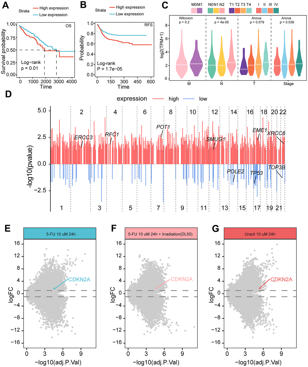 In order to investigate the relationship between the clinical application value of CDKN2A in colorectal cancer, we conducted survival analysis and found that patients with high expression of CDKN2A had worse survival prognosis (Figure 6A, 6B). Clinical pathological parameters showed that CDKN2A was correlated with higher T, N staging, and pathological staging (Figure 6C), indicating that CDKN2A can serve as a biomarker for clinical prognosis. Given the previously observed heightened activity in nucleotide metabolism (Figure 4B, 4C), we inferred that the expression of CDKN2A can also serve as an indicator of genomic alterations. Therefore, we compared the gene mutations between the high and low CDKN2A expression groups and found that the genomes of the high expression group exhibited extensive mutations, including some genes involved in DNA damage repair (Figure 6D). Furthermore, in the 5-fluorouracil-resistant (5-FU-R) and 5-fluorouracil-sensitive (5-FU-S) cell lines screened after drug resistance induction, we found that the 5-FU-S group exhibited high levels of CDKN2A expression during treatment with 5-fluorouracil, 5-fluorouracil plus radiation therapy, and uracil (Figure 6E–6G). This indicates that the high expression of CDKN2A may suggest increased sensitivity to chemotherapy and the combination of radiation therapy and chemotherapy.