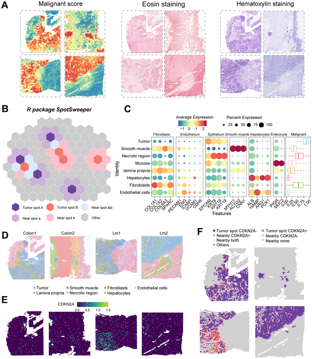 Four spatial transcriptomic samples of colorectal cancer and liver metastases were obtained from the Single-Cell Colorectal Cancer Liver Metastases database and named colon1, colon2, lm1, and lm2 [25]. Samples were normalized separately using SCTransform. The SpaCET.deconvolution function from the spaCET package was used to calculate the malignancy score for spots [26]. Hematoxylin and eosin (H&E)-stained sections were segmented using QuPath to characterize the tumor and normal regions [18]. To accurately annotate spots, we considered the following: 1) Seurat clustering, 2) marker expression, 3) SpaCET malignancy scores, 4) H&E staining, and 5) pathological review. Finally, the spot annotation was manually adjusted using our developed package SpotSweeper. In tumor regions, spots were defined as CDKN2A+ spots, CDKN2A- spots, or others (necrotic region). In nontumor regions, spots were classified as nearby CDKN2A+, nearby CDKN2A-, nearby none, or nearby both based on proximity to CDKN2A+ or CDKN2A- spots.