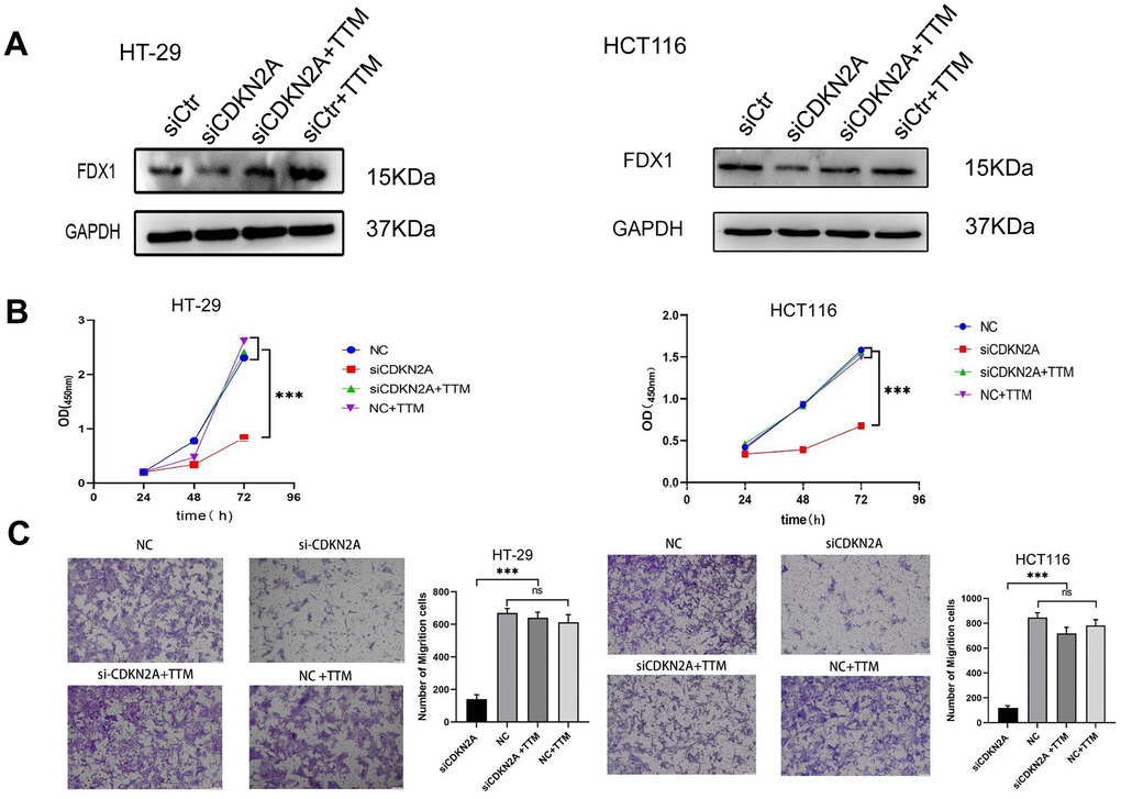 To assess the potential of CDKN2A in regulating CRC cell behavior through cuproptosis inhibition, we employed siRNA to silence CDKN2A expression in cells. As depicted in Figure 9A, cell viability was diminished, and the expression of iron-sulfur cluster protein FDX1 decreased in CDKN2A-knockdown HT-29 and HCT116 cells. Moreover, the attenuated CDKN2A expression led to reduced migratory capacity in HT-29 and HCT116 cells. However, upon supplementation with a cuproptosis inhibitor, cell proliferation and migration were restored, accompanied by a reversal in FDX1 expression (Figure 9B, 9C). These findings collectively indicate the pivotal role of CDKN2A in modulating the growth and migration of CRC cells through its interaction with cuproptosis.
