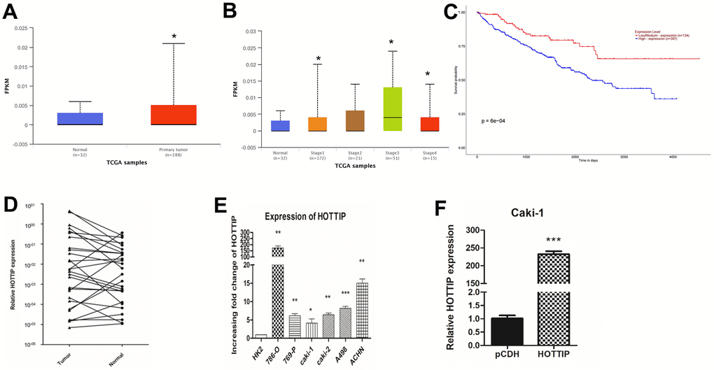 According to the database from TCGA, we verified that lncRNA-HOTTIP was highly expressed in RCC tissues compared with normal tissue (Figure 1A, 1B). Next, we performed the overall survival (OS) analysis by Kaplan-Meier plotter. The chart showed that patients with high levels of lncRNA-HOTTIP had worse clinical outcomes (Figure 1C). The over-expression of lncRNA-HOTTIP was further confirmed using normal and tumor tissue from 29 patients (Figure 1D) and 6 RCC cell lines (Figure 1E). RCC cell lines (Caki-1) with stable overexpression of lncRNA-HOTTIP (HOTTIP) were constructed and screened for future experiments (Figure 1F).