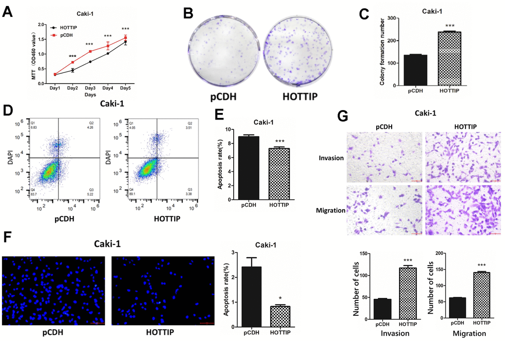 The cells in Caki-1-HOTTIP absolutely increase in proliferation ability according to the MTT result at different time points (Figure 2A). The clone formation results reveal the increase in number and proliferation higher in comparison with the control group (Caki-1 cell with lentiviral-mediated normal control plasmid, Caki-1-pCDH) (Figure 2B, 2C). Moreover, the results of flow cytometry (Figure 2D, 2E) and Hoechst apoptosis assay (Figure 2F) further confirm a less apoptotic rate in Caki-1-HOTTIP cells. Transwell test showed that the invasion and migration ability of Caki-1-HOTTIP cells was enhanced compared with Caki-1-pCDH cells (Figure 2G). Therefore, we speculate that lncRNA-HOTTIP can promote the malignant progression of RCC, but its potential mechanism of action in RCC still needs to be further studied.