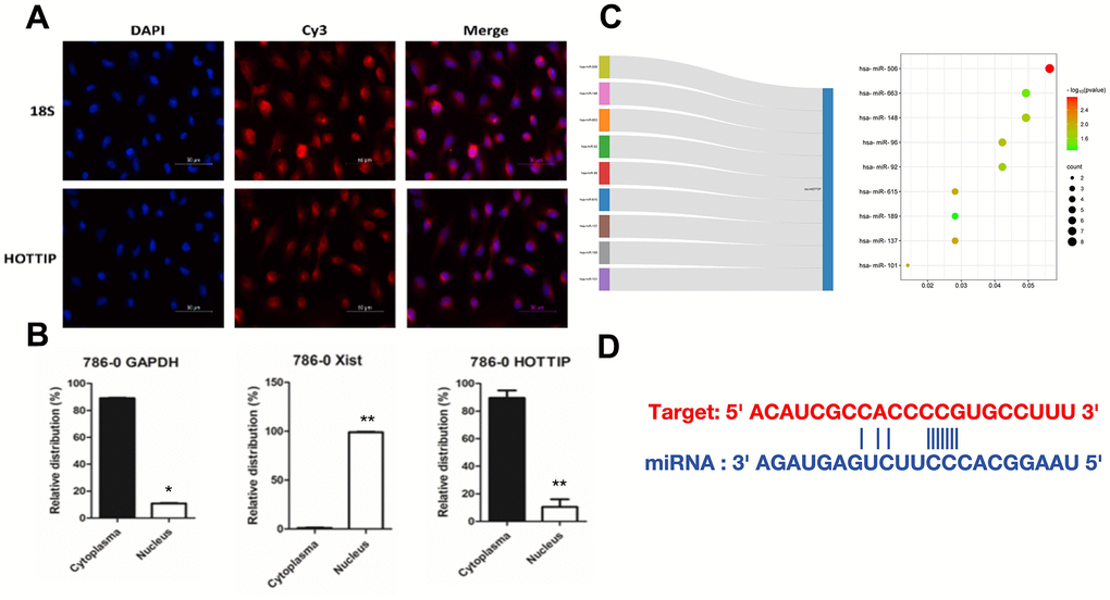 The premise of the ceRNA regulatory model is based on lncRNA located in the cytoplasm. Our previous studies found that lncrNA-HOTTIP is a lncRNA located in the cytoplasm of RCC. Previous studies 786-0 cell line with high lncRNA-HOTTIP expression. In comparison with the negative control of 18s, the selection of Caki-1-HOTTIP by FISH (fluorescence in situ hybridization) technology proved that lncRNA-HOTTIP mainly existed in the cytoplasm in space (Figure 3A). The use of plasmolysis further confirmed that lncRNA-HOTTIP is mainly present in the cytoplasm (Figure 3B). As stated in the Introduction, increasing numbers of studies have suggested that lncRNAs may act as ceRNAs in regulating the biological functions of miRNAs. In this study, to further explore the underlying mechanisms of action of HOTTIP and its role in the development of RCC, we first examined a set of miRNAs that were predicted to bind HOTTIP using TargetScan. Bioinformatics analysis revealed that the HOTTIP transcript contained putative binding sites for miR-506 (Figure 3C, 3D).