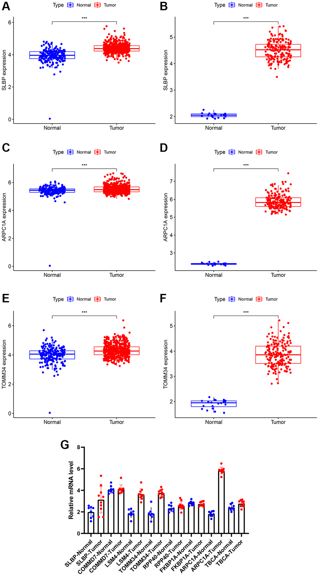 Differential analysis through the expression matrix pertinent to mitochondria-related genes in the public database was performed and verified through RT-PCR experiments on clinical specimens (Table 2). Due to the lack of normal control sample data in the TCGA related to low-grade glioma, we combined TCGA and GTEx for differential analysis; subsequently, the normal brain tissue data was obtained from CGGA for differential analysis. Expression of the mitochondria-related genes including SLBP, ARPC1A, and TOMM34 (TCGA database) were significantly higher in cancer tissues than the normal tissues (Figure 2A, 2C, 2E). Expression of TBCA, COMMD7, LSM4, and FKBP1A were significantly lower in the cancer tissues than the normal tissues. However, there was no significant difference observed in the expression of RPP40 (Supplementary Figure 2A, 2C, 2E, 2G, 2I). In the case of CGGA, the expression of SLBP, ARPC1A, and TOMM34 were greatly differed between LGG cancerous tissues and adjacent normal tissue (Figure 2B, 2D, 2F) and (Supplementary Figure 2B, 2D, 2F, 2H, 2J). The expression of these mitochondria-related genes was examined through RT-PCR studies. The expression difference of ARPC1A was significantly higher when compared to all other genes and also higher than the adjacent genes and its role in the progression was determined through the following studies (Figure 2G).