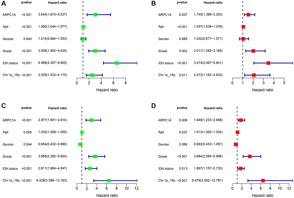 Clinical information pertinent to the LGG patients from the TCGA database delineating the expression profiles of ARPC1A was obtained. We obtained clinical information that included age, gender, WHO grade, IDH mutation status, Ch.1p19q co-deletion status. First, we analyzed the correlation between high and low expression of ARPC1A in different clinical information including gender, WHO grade, IDH mutation status, Ch.1p19q co-deletion status. Univariate and multivariate Cox regression models were typically employed to screen and analyze these variables. A total of five factors were obtained that have significance including on the prognosis of LGG patients through ARCP1A expression. A nomogram was constructed and C-index, ROC analysis was used to evaluate its consistency.