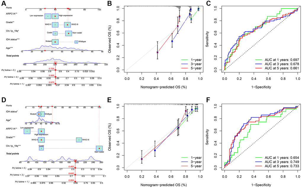 We analyzed common clinical risk factors for glioma, including age, gender, WHO grade, IDH mutation status, 1p19q co-deletion status, and high and low expression of ARPC1A. The results of the correlation analysis suggesting the expression of ARPC1A with WHO grade and IDH mutation status were validated in both the TCGA and CGGA databases, suggesting that the expression of the gene was significantly higher with increasing grade and inside wild-type patients with IDH status (Supplementary Figure 3C, 3D, 3E, 3F). While gender and 1p19q co-deletion status were only validated in one database (Supplementary Figure 3A, 3B, 3G, 3H). Depending the data obtained from TCGA, Cox regression analysis described that age (p < 0.001, p < 0.001), WHO grade (p < 0.001, 0.002), IDH mutation status (p < 0.001, p < 0.001), 1p19q co-deletion status (p < 0.001, 0.011) and high and low expression of ARPC1A (p < 0.001, 0.037) were all related to poor prognosis (Figure 3A, 3B). Depending on the data obtained from CGGA, Cox regression analysis described that age (0.005, 0.037), WHO grade (p < 0.001, p < 0.001), IDH mutation status (p < 0.001, 0.013), Ch.1p_19q co-deletion status (p < 0.001, p < 0.001) and high and low expression of ARPC1A (p < 0.001, 0.008) were all related to poor prognosis (Figure 3C, 3D). Hence, a nomogram through these factors was constructed and the calibration curve was verified (Figure 4A, 4D). The nomogram model including the high and low expression of ARPC1A can bestow better prediction of 1-, 3-, 5-year survival rates pertinent to the prognosis of LGG patients; analysis of receiver operating characteristic (ROC) curve reported that ARPC1A is a significant predictor of 1-year, 3-year, and 5-year survival (Figure 4B, 4C, 4E, 4F).