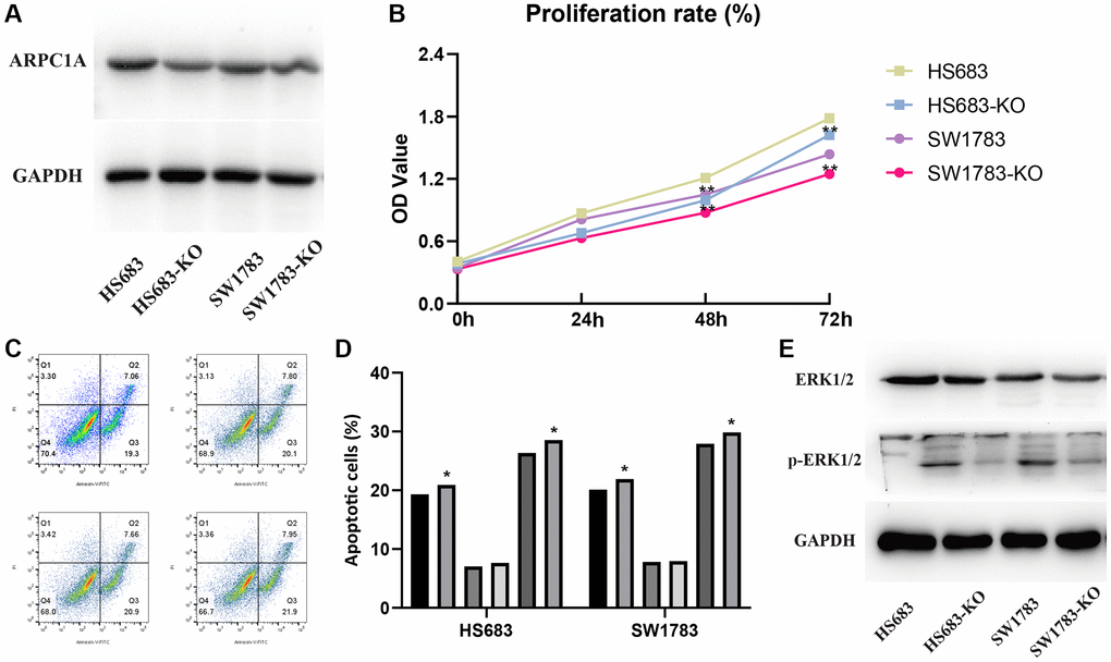 Transfection assays in the two cell lines described the higher expression of ARPC1A (Figure 6A) when compared to knockout, whereas the CC-8 assay described the decreased proliferation ability of LGG cell lines after ARPC1A knockdown (Figure 6B). Flow cytometry analysis described that the number of apoptotic population has significantly increased upon knockdown of ARPC1A than control groups. These results typically concluded the active involvement of ARPC1A in promoting LGG proliferation and inhibiting the apoptosis of LGG cells (Figure 6C, 6D). As for vimentin analysis, we did not find a significant difference, suggesting that ARPC1A does not have a significant effect on epithelial mesenchymal transition (Supplementary Figure 5). To elucidate the involvement of the MAPK signaling pathway through ARPC1A, ERK1/2 and phosphor-ERK1/2 was verified. Upon knockdown of ARPC1A, the expression of p-ERK1/2 was inhibited (Figure 6E and Supplementary Figure 6). Therefore, we speculate that overexpression of ARPC1A in LGG promotes the progression of LGG by activating the MAPK pathway.