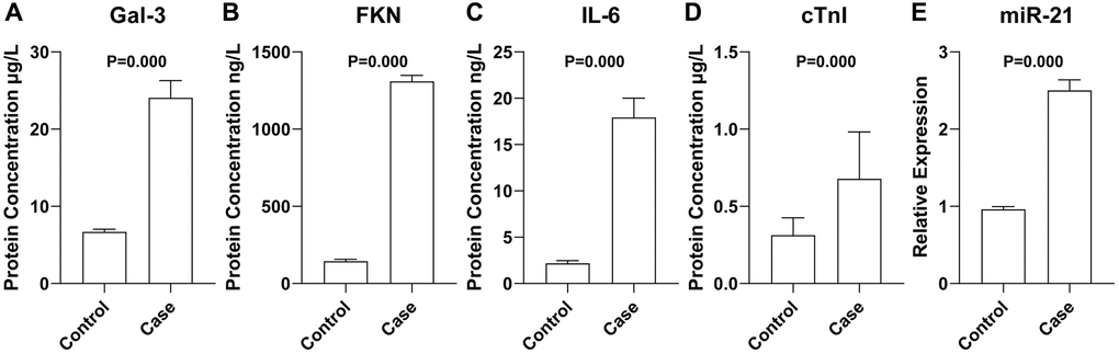 As presented in Figure 1, participants in the case group had a significantly higher level of Gal-3, FKN, IL-6, miR-21, and cTnI than that of participants from the control group (P < 0.0001).