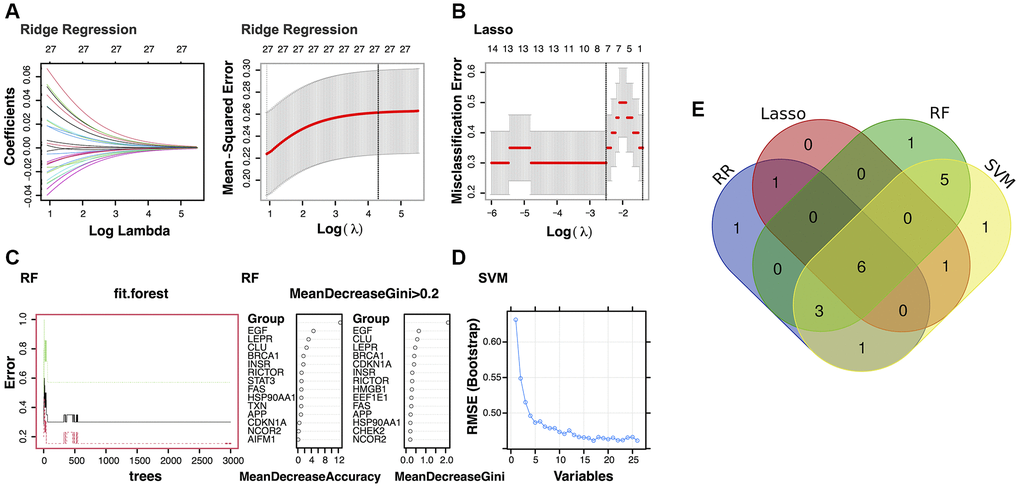 Machine learning techniques, such as LASSO, SVM, RF, RR, were implemented utilizing the glmnet, randomForest, e1071, and glmnet R packages, respectively, to construct classifiers of diagnosis. Six potential diagnostic biomarkers were identified using the four machine learning methods and visualized in a Venn diagram.