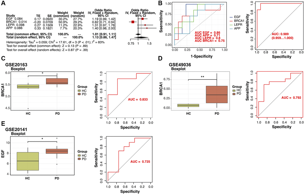 The diagnostic performance of four potential diagnostic biomarkers was assessed through ROC curve analysis. The areas under the ROC curves for each gene were as follows: EGF (AUC = 0.86), APP (AUC = 0.71), LEPR (AUC = 0.8), and BRCA1 (AUC = 0.75). Upon combining all four potential diagnostic biomarker genes into a single diagnostic model, the AUC reached 0.98 in the training dataset. Subsequently, external validation of the diagnostic efficacy of these four genes was conducted using GSE20163, GSE49036, and GSE20141 datasets. The results revealed a notable difference in BRCA1 expression in the GSE20163, GSE49036 datasets (Figure 3C, 3D) and good diagnostic accuracy for the detection of PD: in GSE20163, AUC = 0.833 and in GSE49036, AUC = 0.792. In data from GSE20141, only EGF showed high expression in the PD group and good prediction efficacy (AUC = 0.725; Figure 3E).