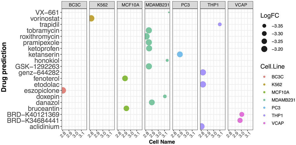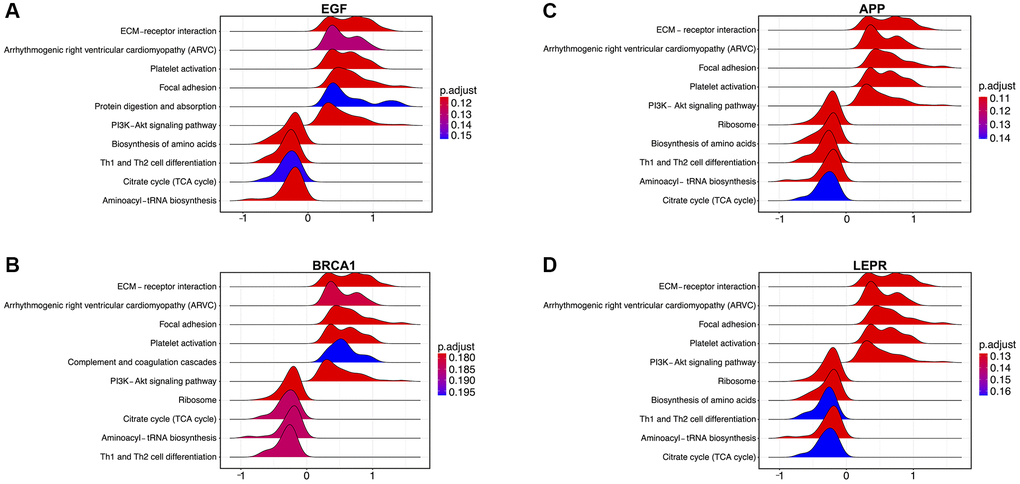 Next, to investigate the potential mechanisms underlying the contribution of the four potential diagnostic biomarker genes to the occurrence of PD, we utilized the GeneMANIA online tool to construct a PPI network for these genes. The result is shown in Figure 4. As vividly shown in the figure, BRCA1 had a strong physical interaction with EGFR, which is crucial for susceptibility to PD in the Han Chinese population [26]. Furthermore, BRCA1 was predicted to have a significant association with PARD1 and TP53BP1. Pearson analysis was used to carry out the GSEA enrichment difference analysis in the human KEGG biological pathway set. The analysis revealed positive associations between the four potential diagnostic biomarker genes and the extracellular matrix (ECM)-receptor interaction and focal adhesion KEGG pathways. However, the analysis demonstrated negative associations between the four genes and the tricarboxylic acid cycle and ribosome KEGG pathways, as illustrated in Figure 5. Furthermore, we utilized SigCom LINCS to predict drugs targeting these biomarkers. The top 20 small molecules related to expression regulation enriched for the four potential diagnostic biomarker genes (z-score >3, p-value < 0.05) in seven cell lines are shown in Figure 6.