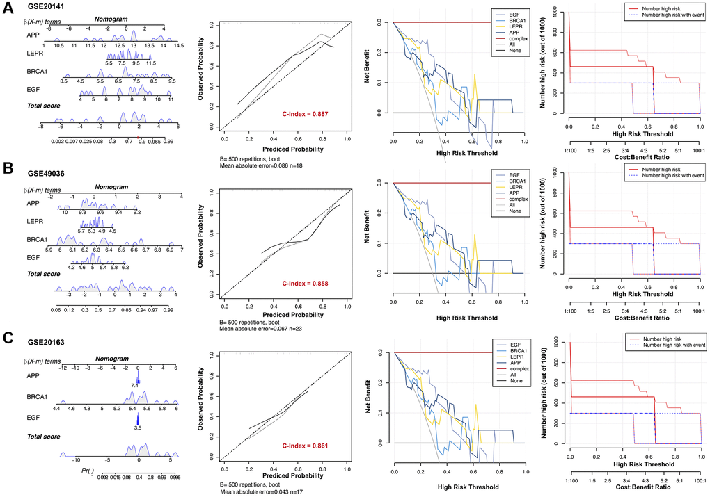 The rms R package was utilized to construct a nomogram model predicting PD occurrence across three validation datasets (GSE20141, GSE49036, and GSE20163). Each factor’s score is represented by “Points”, and the cumulative score of all factors is denoted by “Total Points.” The predictive performance of the nomogram model was evaluated using the C-Index.