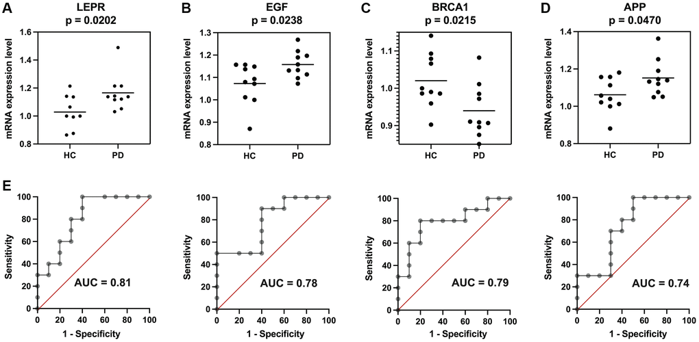 Our study measured RNA expression levels in whole blood, so the study better reflects the usefulness of the four potential biomarker genes in PD diagnosis. The results of qRT-PCR in our study revealed that APP, EGF, and LEPR were significantly upregulated and that BRCA1 was significantly downregulated in PD patients relative to HC subjects, indicating that the four aging-related genes might be reliable diagnostic biomarkers.
