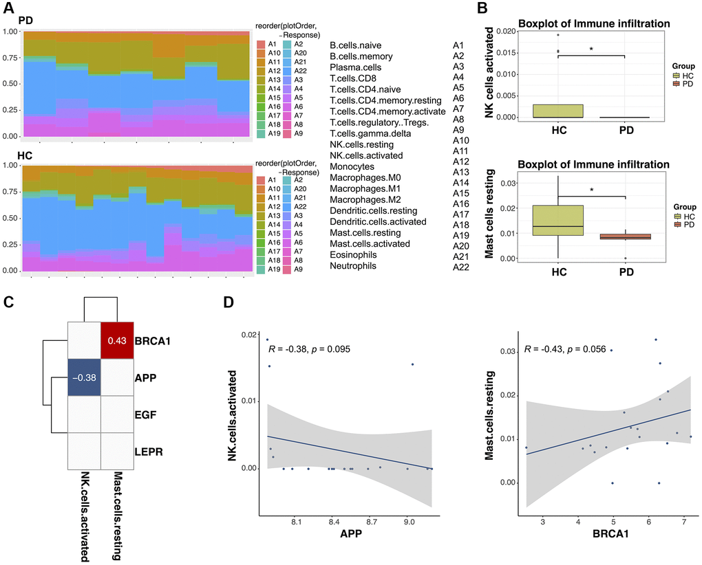 There is substantial evidence suggesting that dysfunction of the immune system contributes to Parkinson’s disease (PD). This evidence comprises various investigation, including clinical and genetic links between autoimmune disease and PD, impaired immune responses at the cellular and humoral levels in PD patients, imaging data revealing activation of inflammatory cells in affected brain regions, and observations of immune dysregulation in PD animal models [27, 28]. Therefore, we compared immune infiltration in PD patients and HC subjects. The ssGSEA algorithm was employed to assess the infiltration of 22 immune cell types in each sample, with the results visualized in a heatmap (Figure 9A). Subsequently, the Wilcoxon test was applied to compare the expression levels of immune cells between PD patients and HC subjects. Notably, in Figure 9B, it is evident that resting mast cells and activated natural killer (NK) cells exhibited reduced expression in PD patients compared to HC subjects (p < 0.05). Furthermore, a correlation analysis revealed associations between the expression levels of two biomarker genes (BRCA1 and APP) and the presence of the two immune cell types (p < 0.1, |Coef| > 0.2). Specifically, APP showed a negative correlation with active NK cells (r = −0.38, p = 0.095), whereas BRCA1 demonstrated a positive correlation with resting mast cells (r = 0.43, p = 0.056; Figure 9C, 9D). These findings suggest a potential regulatory role of these biomarkers in PD through interactions with the immune microenvironment.