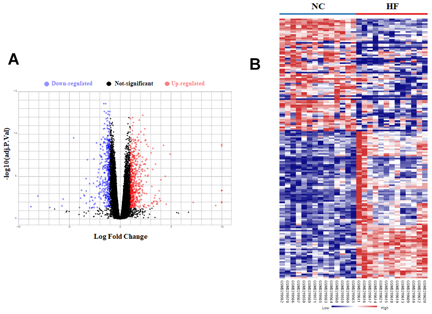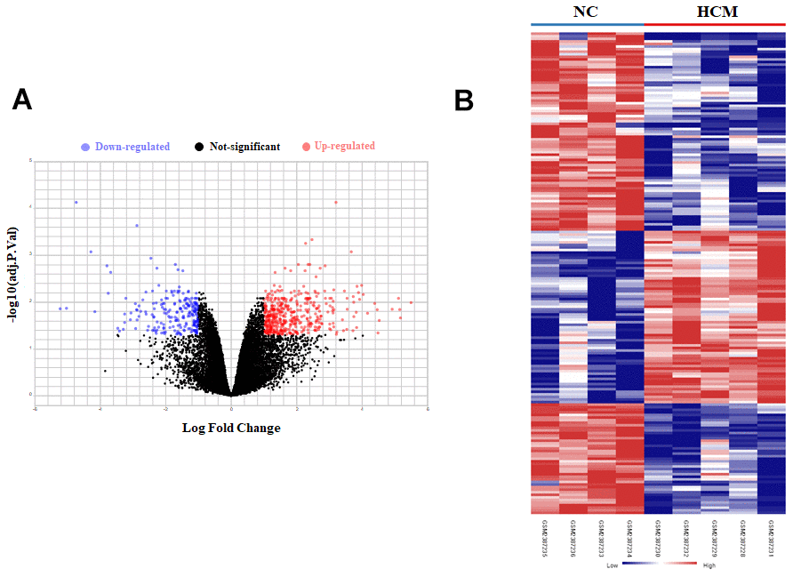 The high-throughput sequencing datasets GSE89714 and GSE116250 were downloaded from Gene Expression Omnibus (GEO) database. GSE89714 dataset formed the study of “Differential gene expressions in the heart of hypertrophic cardiomyopathy patients”, and GSE116250 formed the study of “RNA-seq of heart failure in human left ventricles”. The DEGs were analyzed using linear models for microarray analysis R program with P < 0.05 and logFC > 1 as cut off. The heatmap and the hub genes were created using the NetworkAnalyst program (https://www.networkanalyst.ca/) [9].