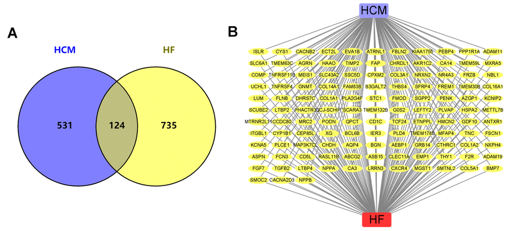 To further analyze the relationship between HCM and HF, the interaction of HCM and HF DEGs was shown in a Venn diagram. We found 124 genes closely related to HF progression (Figure 3A). In addition, we established an HCM-overlap gene-HF network (Figure 3B), highlighting that HCM may deteriorate to HF through these genes.