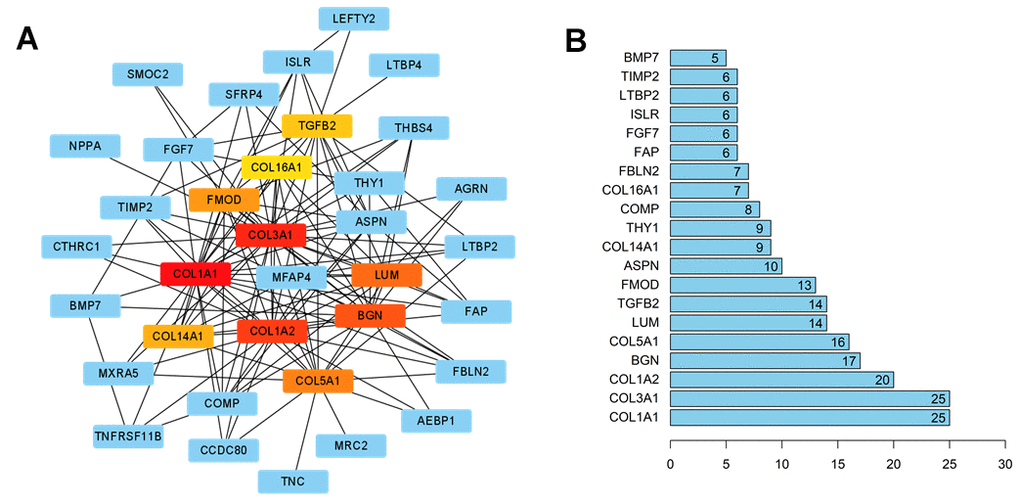 PPI analysis of the 124 overlap genes established a network: the top 10 hub genes were highlighted in red, and other genes connected with hub genes were shown as blue nodes (Figure 4A). Hub genes such as COL1A1, COL3A1, COL1A2, BGN, and COL5A1 are involved in the biological process of HF (Figure 4B).