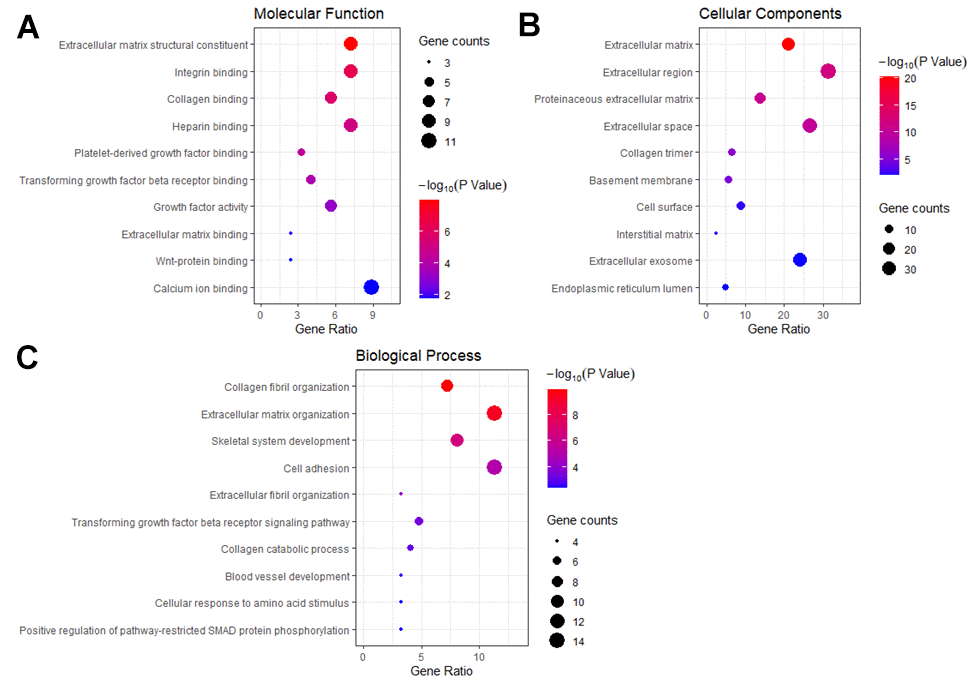GO enrichment analysis showed that extracellular matrix (ECM) structural constituent and collagen binding (Figure 5A), ECM and extracellular region (Figure 5B), and collagen fibril organization and ECM organization (Figure 5C) were enriched and could play an important role in the biological process of HF.