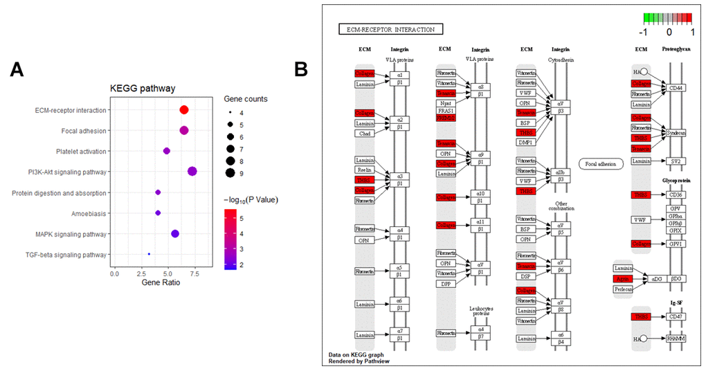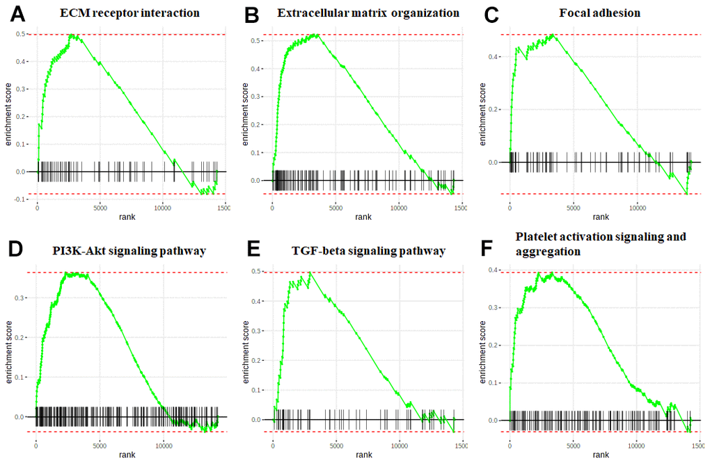 In addition, eight KEGG pathways were enriched (Figure 6A) with genes mainly distributed in ECM-receptor interaction pathway (Figure 6B). Furthermore, GSEA analysis of the overlap genes showed that the DEGs were significantly correlated with ECM organization, ECM receptor interaction, Focal adhesion, TGF-beta signaling, PI3K-Akt signaling, and Platelet activation signaling and aggregation (Figure 7).