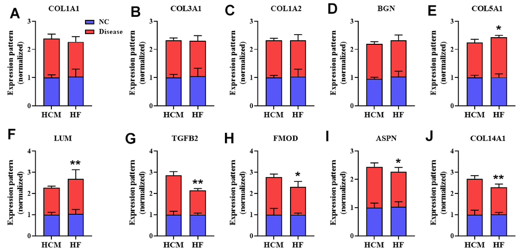 Finally, we selected ten hub genes COL1A1, COL3A1, COL1A2, BGN, COL5A1, LUM, TGFB2, FMOD, ASPN, and COL14A1 to confirm their expression patterns in HCM and HF datasets (Figure 8). Among them, COL5A1 and LUM were significantly increased in the HF dataset (P < 0.05, Figure 8E, 8F), but TGFB2, FMOD, ASPN, and COL14A1 were significantly decreased in the HF dataset (P < 0.05, Figure 8G–8J).