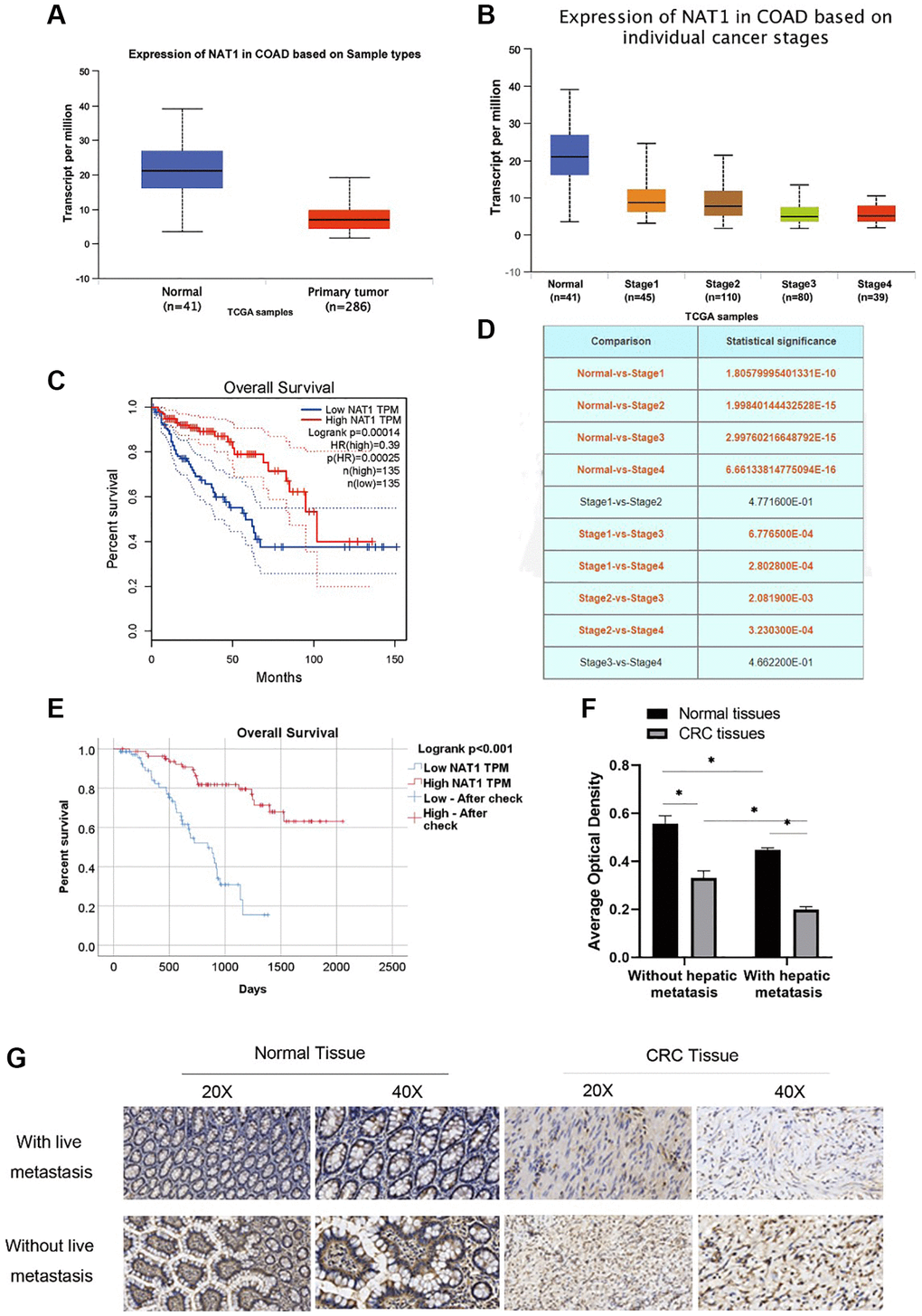 NAT1 in the tissue of colorectal expression differences can be found in UALCAN website (http://ualcan.path.uab.edu/index.html). The expression of NAT1 is low in cancer tissues (Figure 1A), and there are differences in the expression of NAT1 in different stages of colorectal cancer. The expression of NAT1 is also different in different stages of colorectal cancer, and the higher the stage, the lower the expression of NAT1. Figure 1D shows the statistical results of the differential expression of NAT1 in different stages (Figure 1B, 1D). Compared with cancer tissue, NAT1 was highly expressed in normal tissue. The survival analysis results showed that patients with high NAT1 expression had longer overall survival (Figure 1C). According to the immunohistochemical results of tissue chips in 155 patients with liver metastasis of colorectal cancer, the patients were divided into high expression group and low expression group for survival analysis. The results showed that the survival of patients in the high expression group was longer (45.23 ± 2.31 months) than that in the low expression group (26.93 ± 1.81 months) (Figure 1E). We also obtained pathological sections of 6 patients with colorectal cancer and 6 patients with liver metastases of colorectal cancer from the Department of Pathology for immunohistochemical experiments. Experimental results showed that, compared with paracancer tissues, NAT1 expression was lower in colorectal cancer patients and cancer tissues of patients with liver metastasis; in addition, the expression of NAT1 in colorectal cancer tissues of patients with liver metastasis was lower than that in cancer tissues of patients without liver metastasis (Figure 1F, 1G), indicating that low NAT1 expression may be related to liver metastasis of colorectal cancer. Low expression of NAT1 may promote liver metastasis of colorectal cancer. Therefore, our study highlights the importance of NAT1 in liver metastasis of colorectal cancer and suggests that NAT1 can be used as a potential prognostic marker and therapeutic target to improve the clinical treatment of metastatic colorectal cancer.