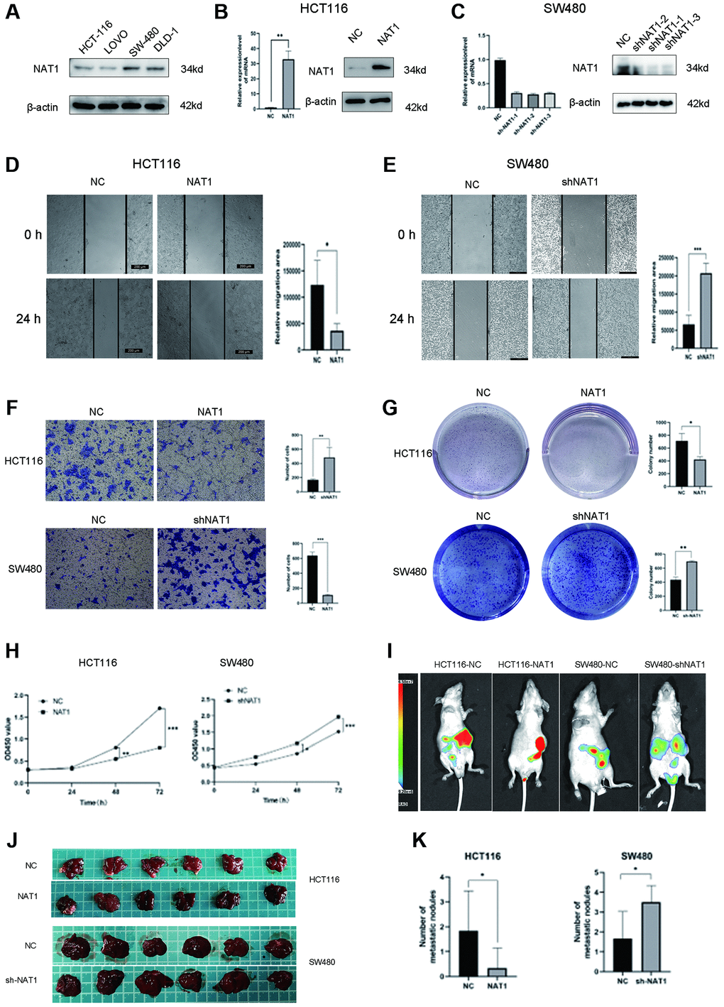 Figure 2J animal experiments were divided into four groups of animal models: HCT116-NC, HCT116-NAT1, SW480-NC, and SW480-shNAT1. Each mouse in each group was injected with 2 × 106 cells into the spleen of each mouse. The mice were killed four weeks later, and the liver tissues were taken out.
