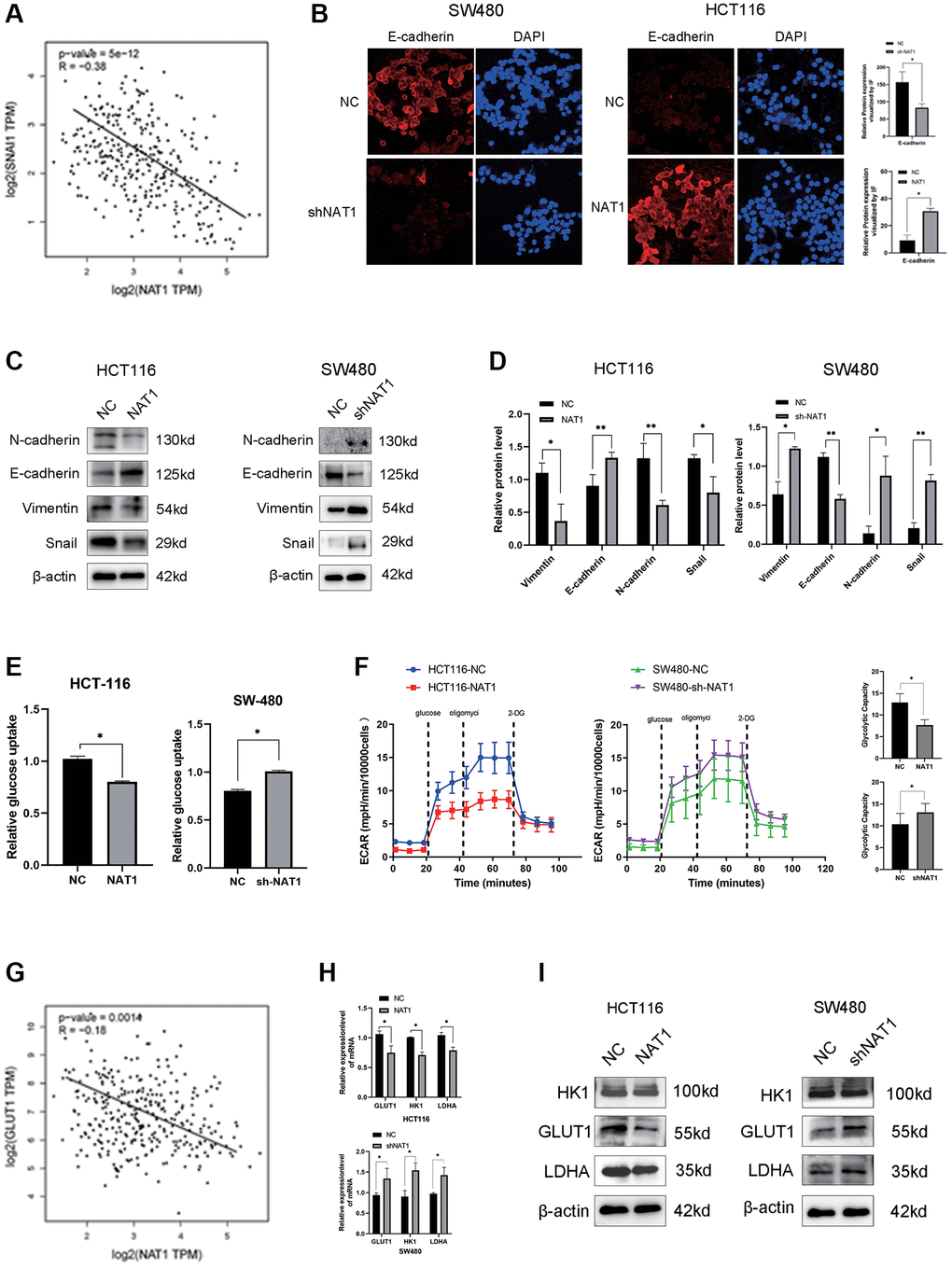 It is well known that EMT plays a key role in tumor metastasis. We speculated whether NAT1 is related to the occurrence and development of EMT. In the TCGA database, we analyzed the expression relationship between NAT1 and the EMT-related protein Snail, showing a significant negative correlation (Figure 3A). In immunofluorescence experiments, E-cadherin of HCT116-NAT1 was significantly increased, while the expression of SW480-shNAT1 was decreased, indicating that NAT1 significantly promoted the expression of E-cadherin (Figure 3B). Next, we also continued to detect the effect of NAT1 on the expression of EMT-related proteins in cells. Overexpression of NAT1 in HCT116 cells reduced levels of EMT-related proteins, including N-cadherin, vimentin, and MMP2 (Figure 3C, 3D). Conversely, overexpression of NAT1 increased E-cadherin levels in CRC cells. The expression of SW480-shNAT1 cells showed the opposite result. Therefore, increased NAT1 levels can inhibit the invasion and migration of colorectal cancer cells by affecting EMT. The results of WB detection were consistent with those of immunofluorescence detection (Figure 3C). In addition, glycolysis is also associated with cancer development and metastasis. We further explored the relationship between NAT1 and glycolysis. First, we detected the relationship between NAT1 and GLUT1 (a key metabolic enzyme in glycolysis) in the TCGA database, and the two were also negatively correlated (Figure 3G), which confirmed our hypothesis. Next, we further analyzed the relationship between NAT1 and glycolysis. Firstly, overexpression of NAT1 significantly inhibited the glucose uptake ability of HCT116 cells, while knockdown of NAT1 significantly promoted the glucose uptake ability of SW480 cells (Figure 3E). Overexpression of NAT1 significantly inhibited the glycolysis capacity of HCT116 cells, while knockdown of NAT1 significantly improved the glycolysis capacity of SW480 cells (Figure 3F). Therefore, we speculated that NAT1 may affect the expression of glycolytic related metabolic enzymes. qPCR and WB results showed that overexpression of NAT1 significantly inhibited the expression of GLUT1, HK1, and LDHA (Figure 3H, 3I). These results indicated that overexpression of NAT1 significantly inhibited EMT and glycolysis of colorectal cancer cells, and further indicated that NAT1 may regulate the occurrence of liver metastasis by regulating EMT and glycolysis of colorectal cancer cells.